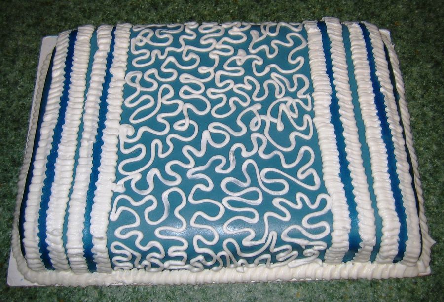 This first attempt at cornelli lace wasn't great, but was just born out of necessity. I tried a new icing recipe and couldn't get it smooth enough so I threw on some mmf to cover it up...which maybe wasn't the best choice because there was too much frosting and it's kind of bubbly. But it's just going to get cut up and served before anyone sees it anyway so who cares! I love using those cakes to practice on because if I screw up no one cares!