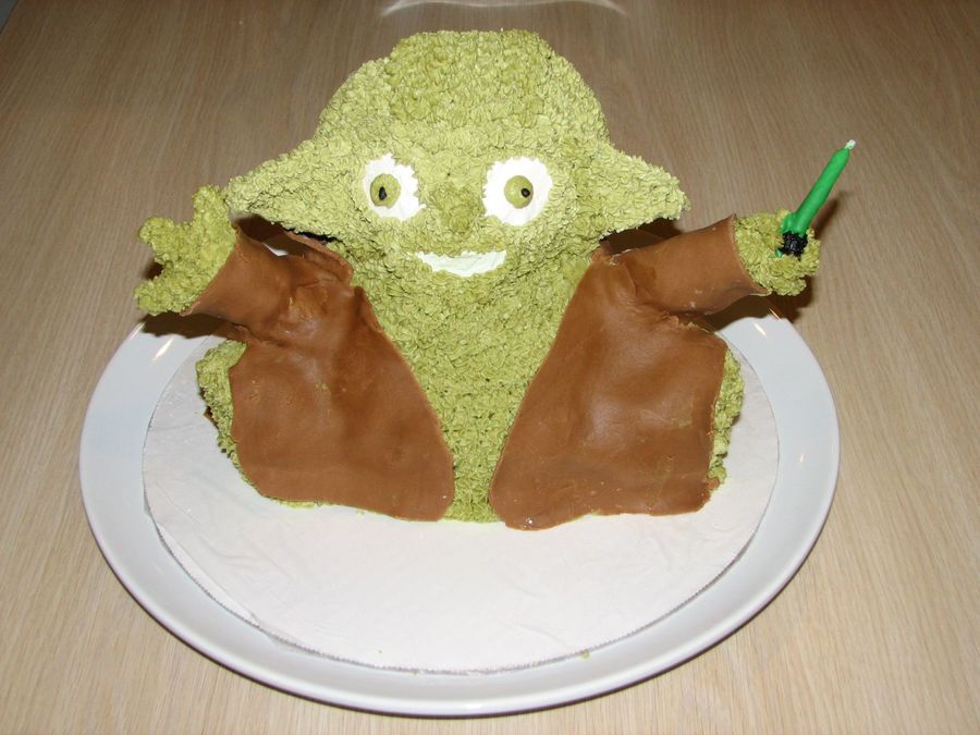 This was a Yoda cake for my nephew's birthday I used the 3D bear pan and just made ears out of fondant and plastic tubes for the arms. and the cap is brown fondant. I would make some changes next time but the kids loved it!