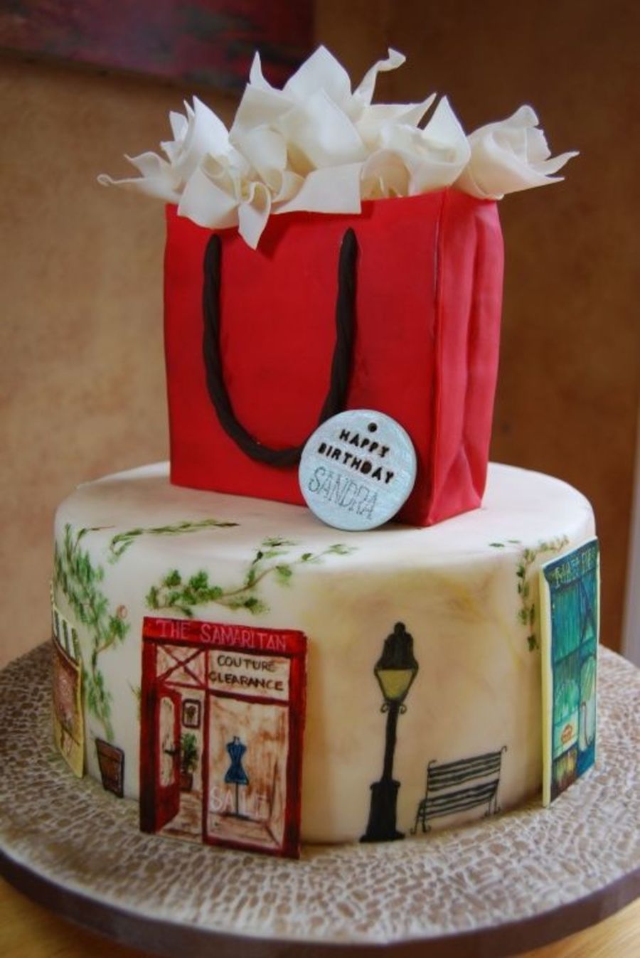 10" fondant covered cake for friend's birthday. made painted shops of the places she liked. vines also hand painted. all other accents also fondant. 6" shopping bag. 4kidsrspecial and i made this cake together--it still took us a LONG time.