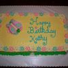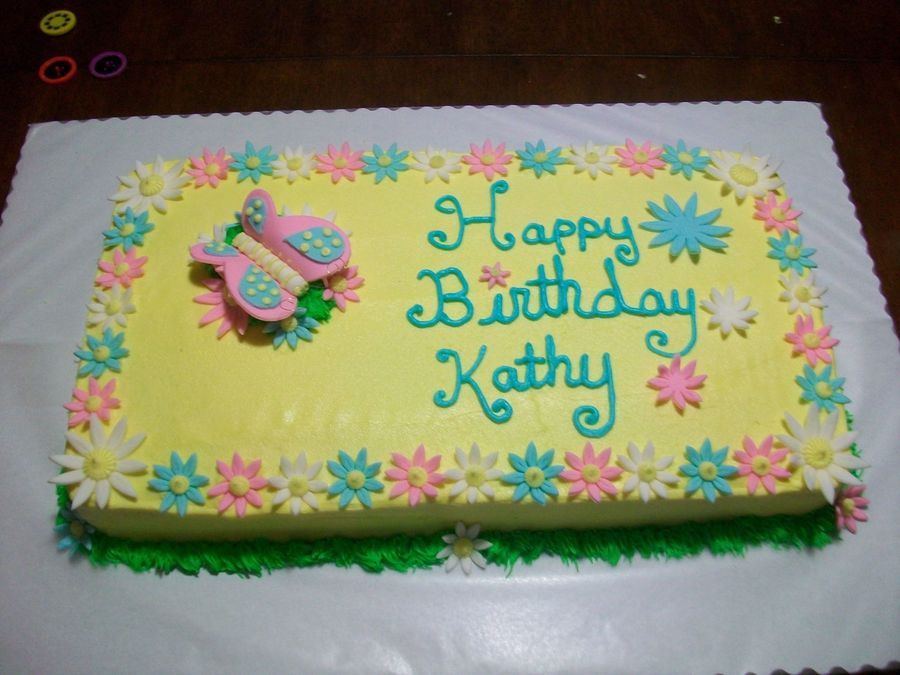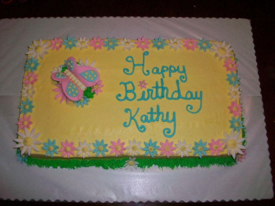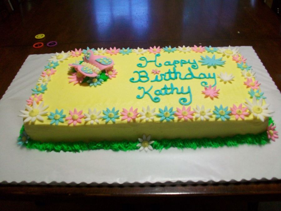 This cake I did last night, got a at last min. call @ 9p.m. customer needed it for her bosses b-day by 8:30 this morning. Customer asked for spring colors and flowers and this is what I put together Thanks to CC. Even though I was very tired from lack of sleep I thought it turned out well. It's half chocolate and half vanilla (two 10x10 in. square pans) cut and put together to fit, w/buttercream icing. Fondant daisies and butterfly.