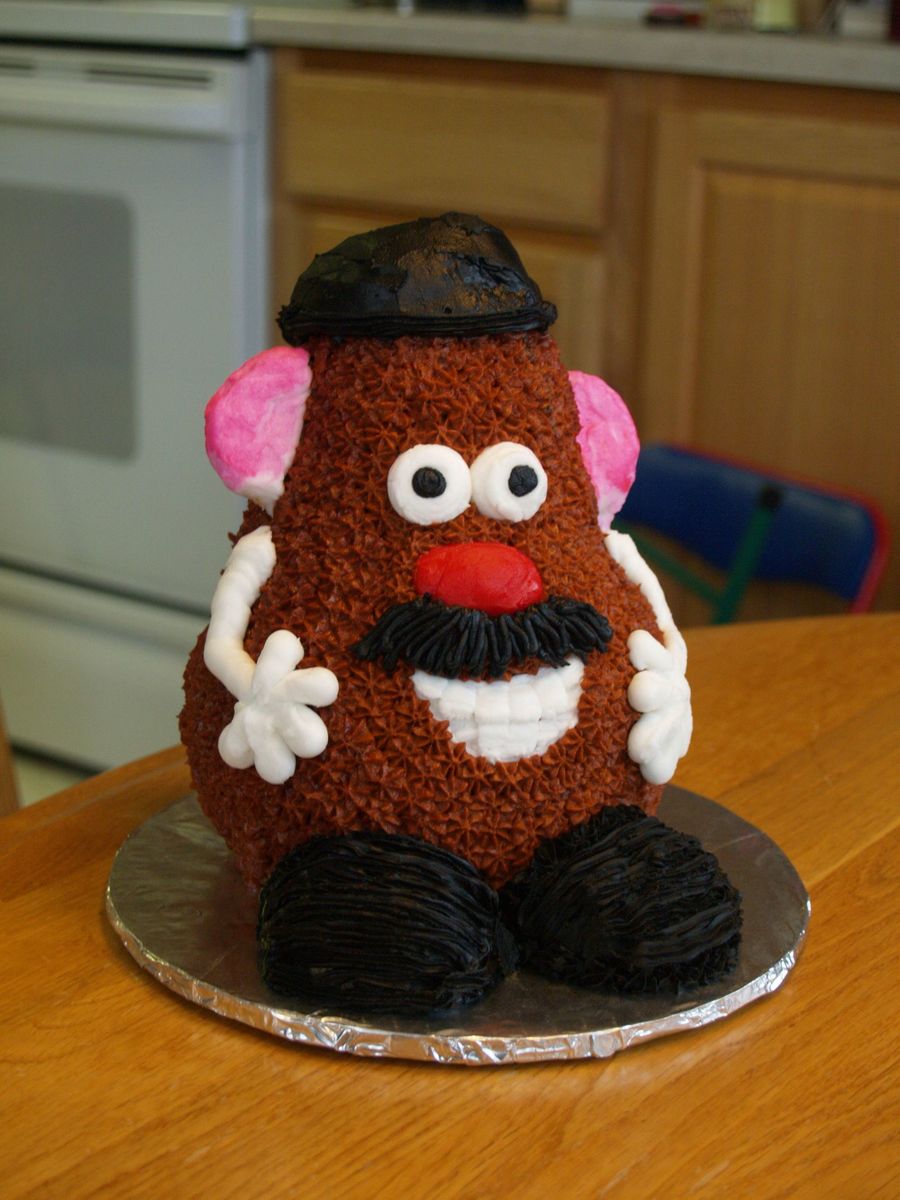 This was a fun little cake I put together for an auction at my son's school. I had always wanted to try a Mr. Potato Head cake so it was a perfect excuse to do so! It is a chocolate cake with buttercream icing. I used the sports ball pan for the bottom of him and the mini ball pan for the top & his hat. I then carved the cake to be the right shape. The feet are rice krispy treats and the ears are cookies covered in icing.