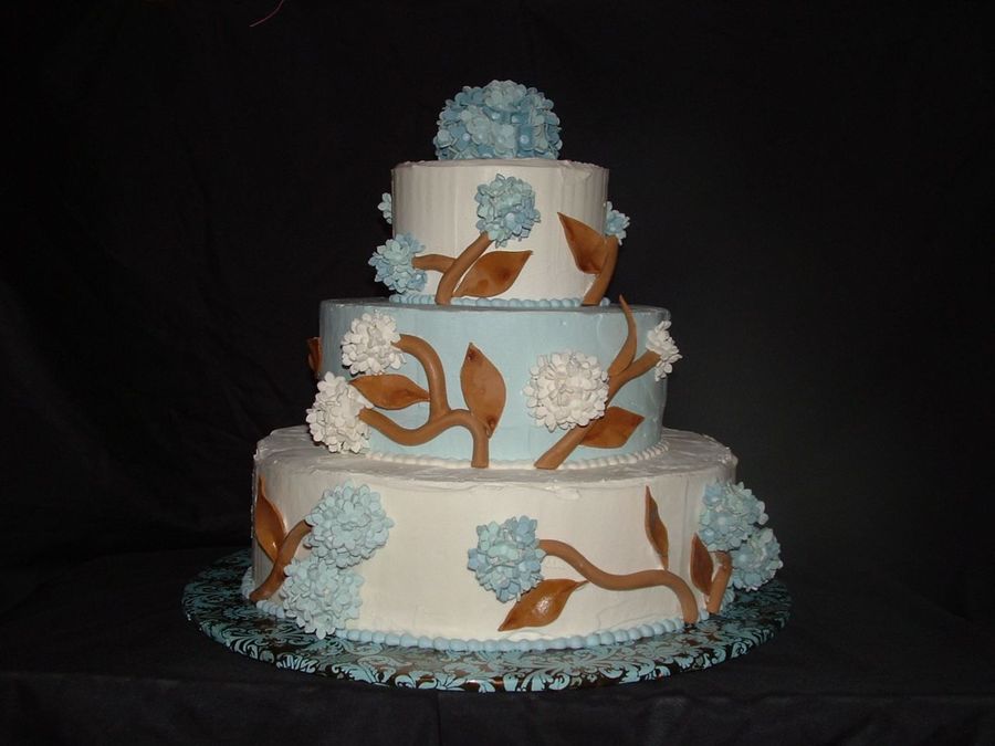 Fake cake iced in royal icing with gumpaste hydrangeas. Based around a design by Confetti Cakes