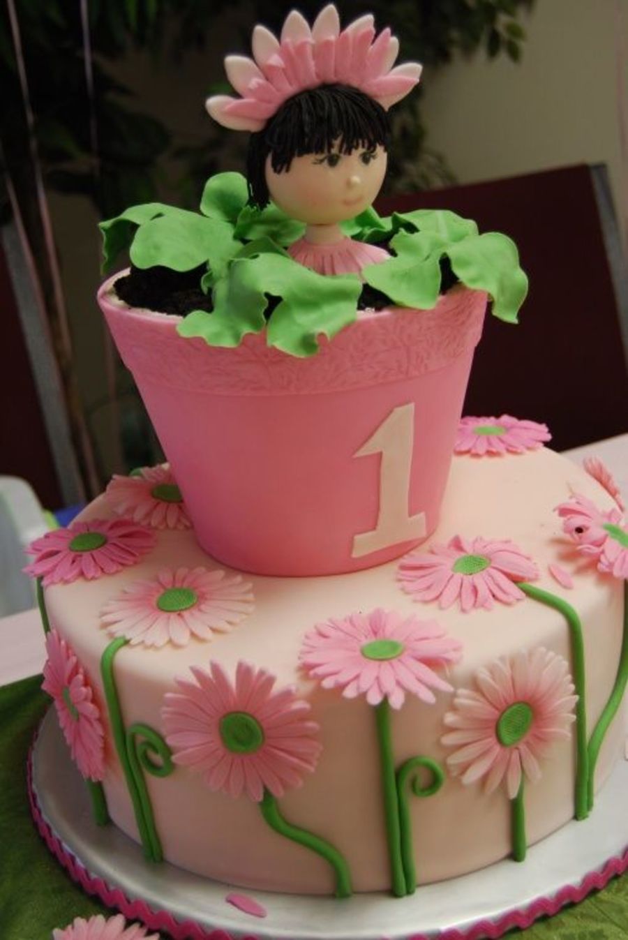 7"pot and 12" bottom tier covered in fondant with fondant accents. idea for bottom tier from one of anne heap's cakes. my friend just wanted a daisy themed cake for her DD's birthday.