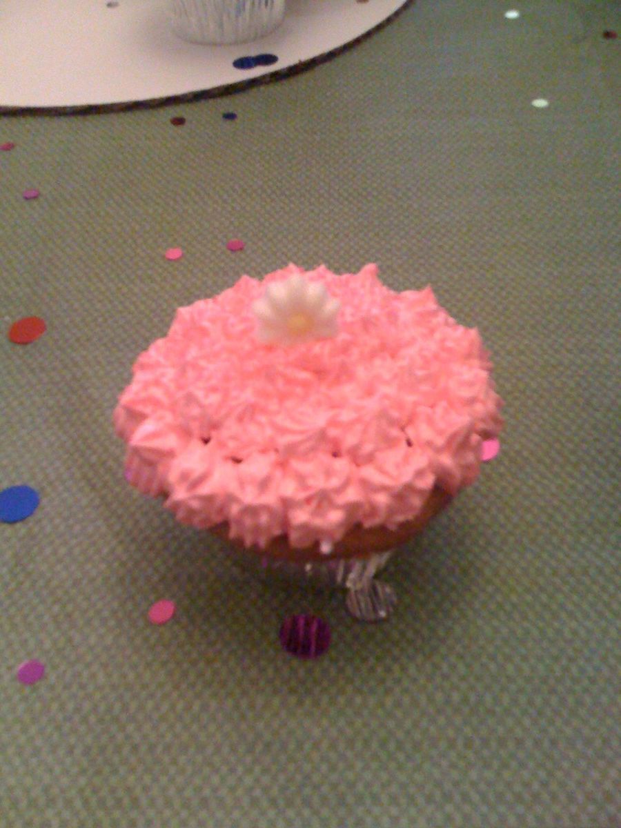 Vanilla cupcakes w/ buttercream icing and white chocolate flowers.
