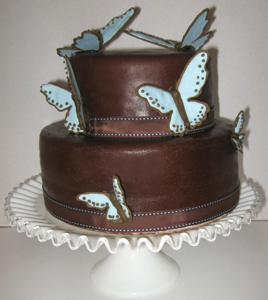 Chocolate Merlot cake with Merlot marscapone mousse covered with chocolate MMF and royal butterflies. I was inspired by a cake in the book Beautiful Cakes.