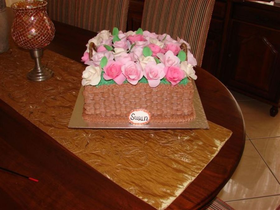 Made for a 70th birthday. 45 roses were made for this cake. basket is iced in buttercream