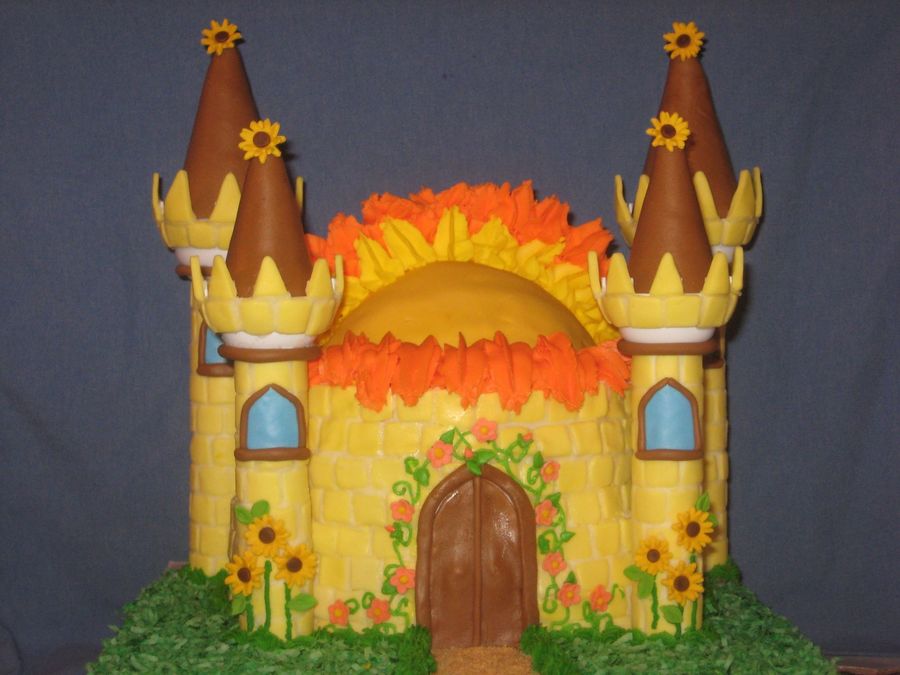 This was my entry in the Wilton castle cake contest - I had never covered a cake in fondant before this one. It was a summer theme so I decided to make the "Castle of the Sun" I used the Wilton ball pan to make the sun on top of the castle. I made MMF to cover the cakes and the castle pieces. I cut out fondant squares and stuck them to the bc to look like yellow stones. The grass is coconut dyed green. It was a fun learning experience.