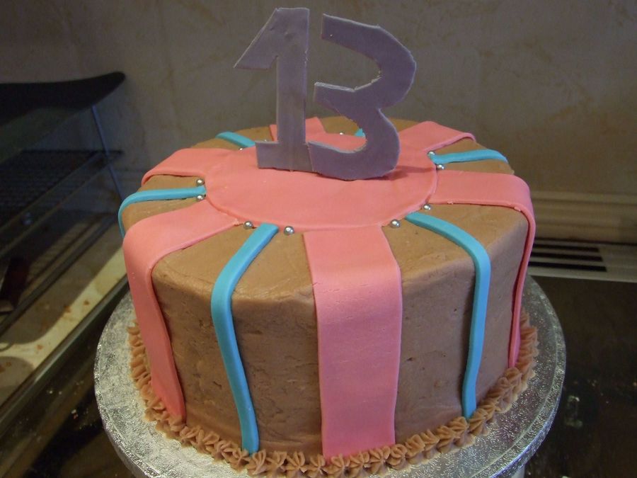 she wanted chocolate, pink, and blue. chocolate victoria sponge, with chocolate bc, fondant accents, and silver dagrees. the 13 is made from gumpaste, held with cocktail sticks.