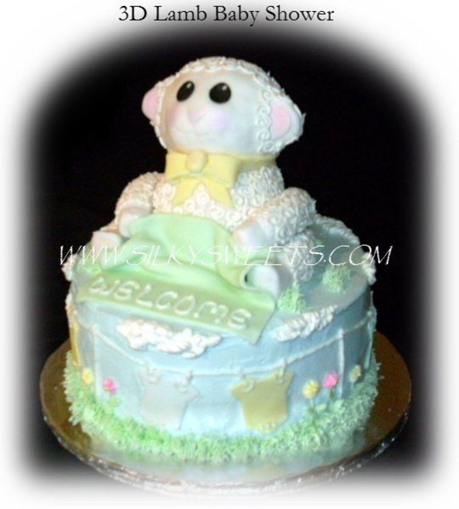 3D fondant covered lamb, made out of RKT. 10" round double layer on bottom. Inspired by a cake here on CC, in the babyshower '09 contest.