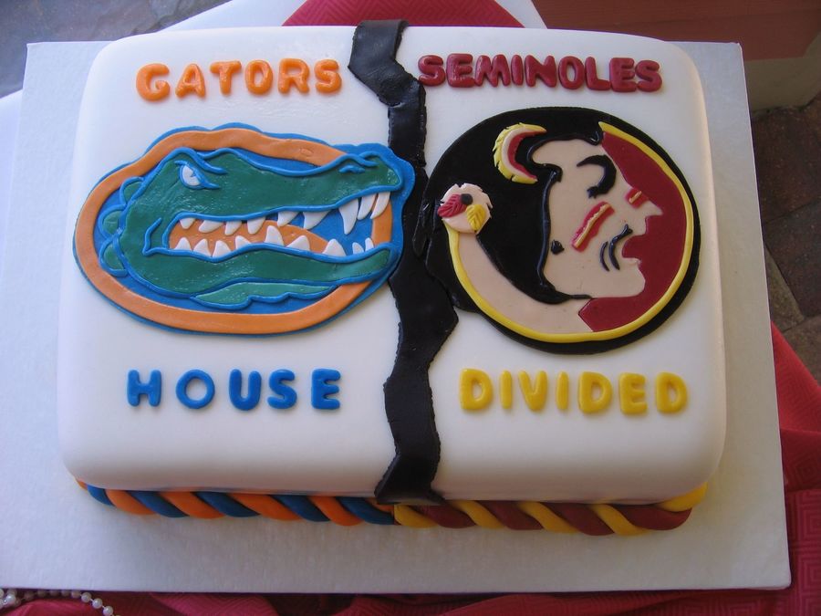 This was a groom's cake, Gators vs Seminoles all done in fondant.
