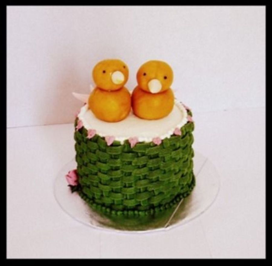 Iced in buttercream, marzipans chicks. I got the idea from the Kate Sullivan book. 5" cake.