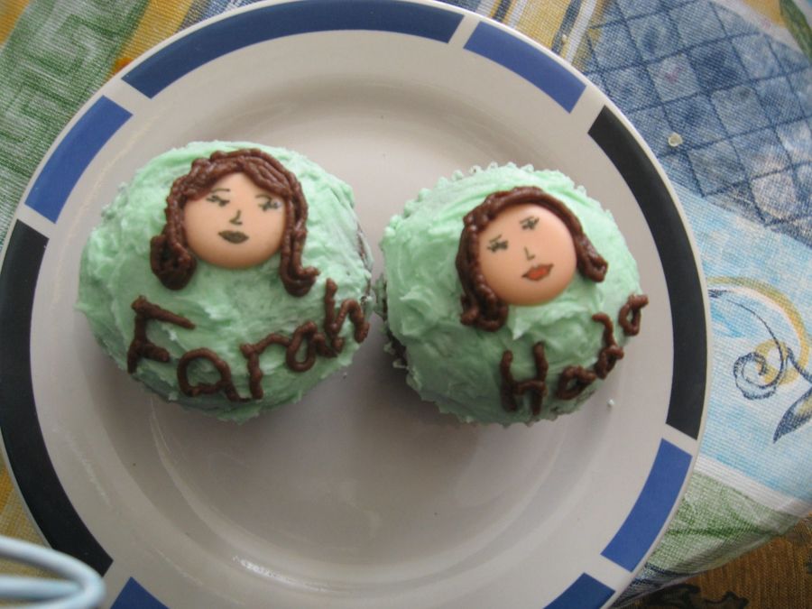 faces are made using color low and edible markers. I tried to make them look like my 2 daughters and wrote their names on the cupcakes. My girls loved the idea.