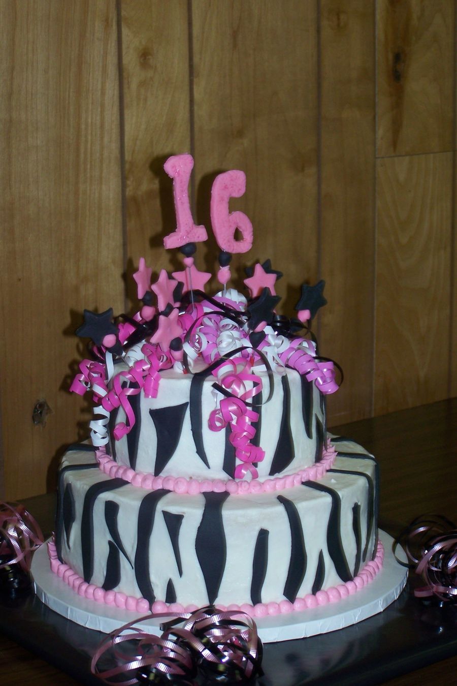 12in 8in white cake with Bc icing with fondant zebra stripes with fondant #'s and fondant stars, curly ribbon