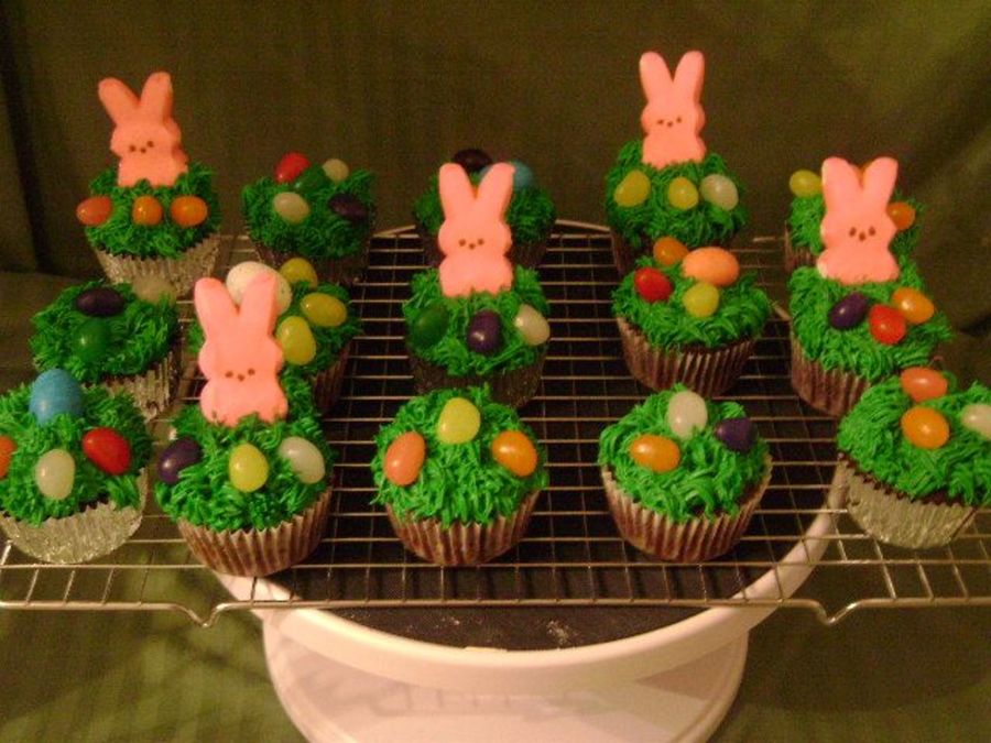 Chocolate cupcakes with vanilla buttercream grass, robin eggs, peeps, and jelly beans.