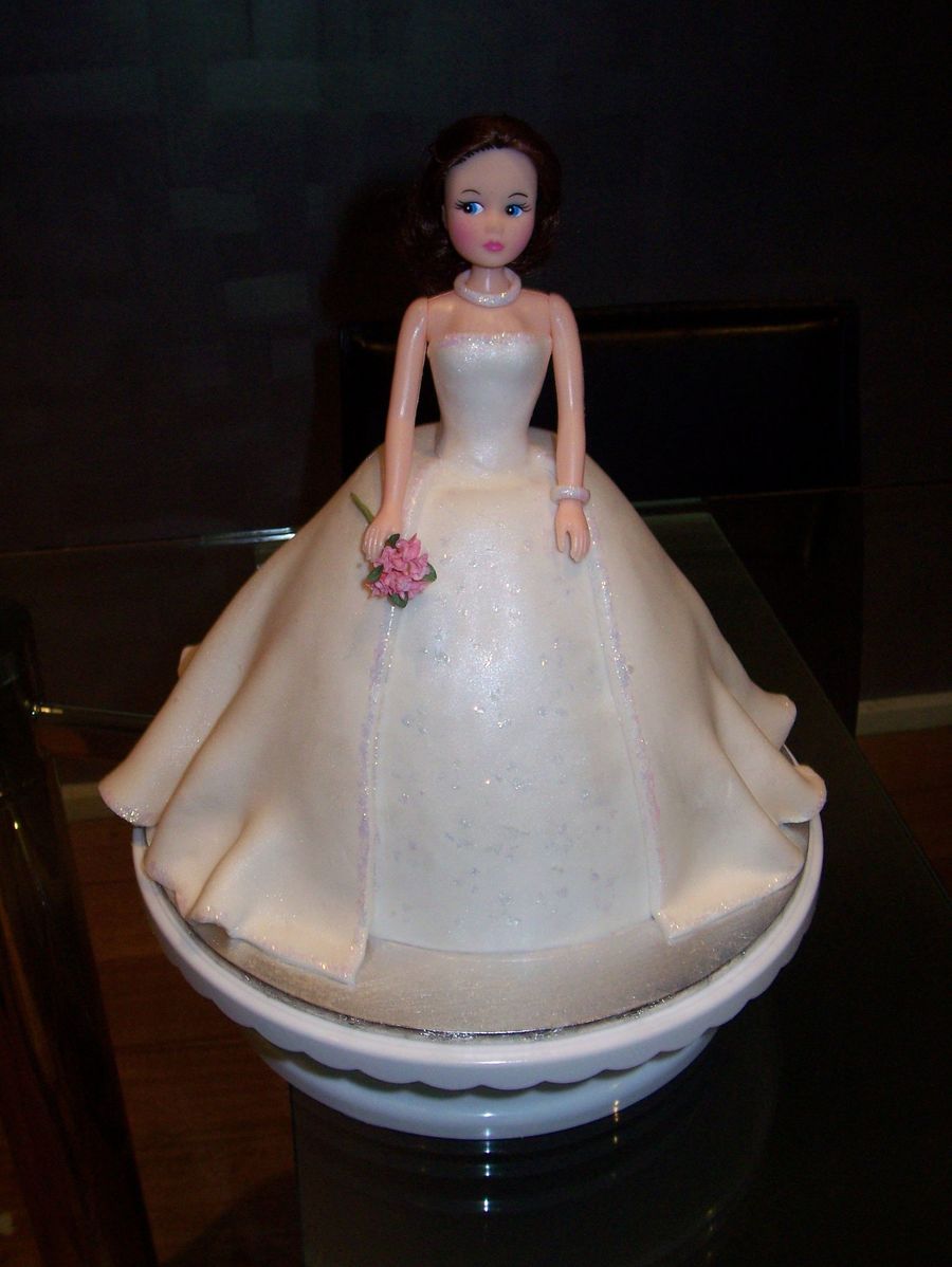 Butter cake. I used fondant for her dress with pearl luster dust and silver/pink holagram glitter. Sugarpaste flowers for bouquet, she also has some in her hair at the back.