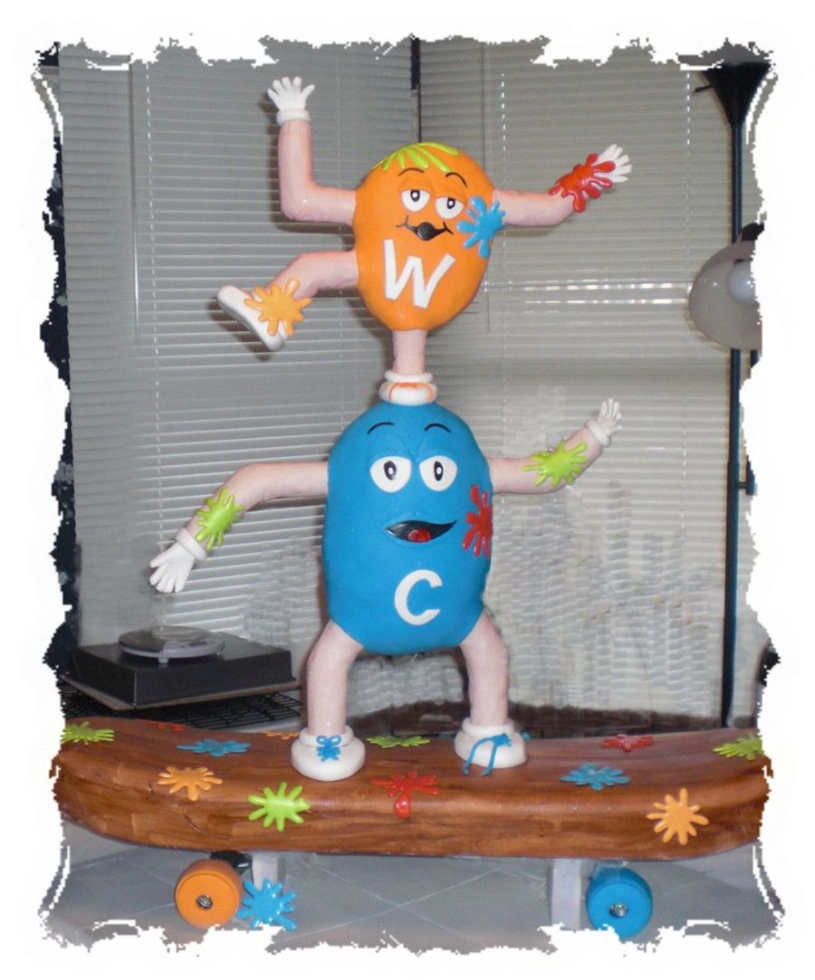 A few weeks ago at a local cake club meeting, I learned how to build an internal cake structure out of pvc pipe, and couldn't wait to try it. My nephews said they wanted two M&M's on a skateboard for their party, so I decided to go for it. It does not look nearly as good in reality as it did in my head, but I got it done and everyone was impressed at the party. Lots of first on this - first time making and using modeling chocolate for the bodies, I used Sugarveil for the paint splatters, pvc pipe internal structure, and we got to use power tools to build the stand. I'd love to hear what you think. TFL.