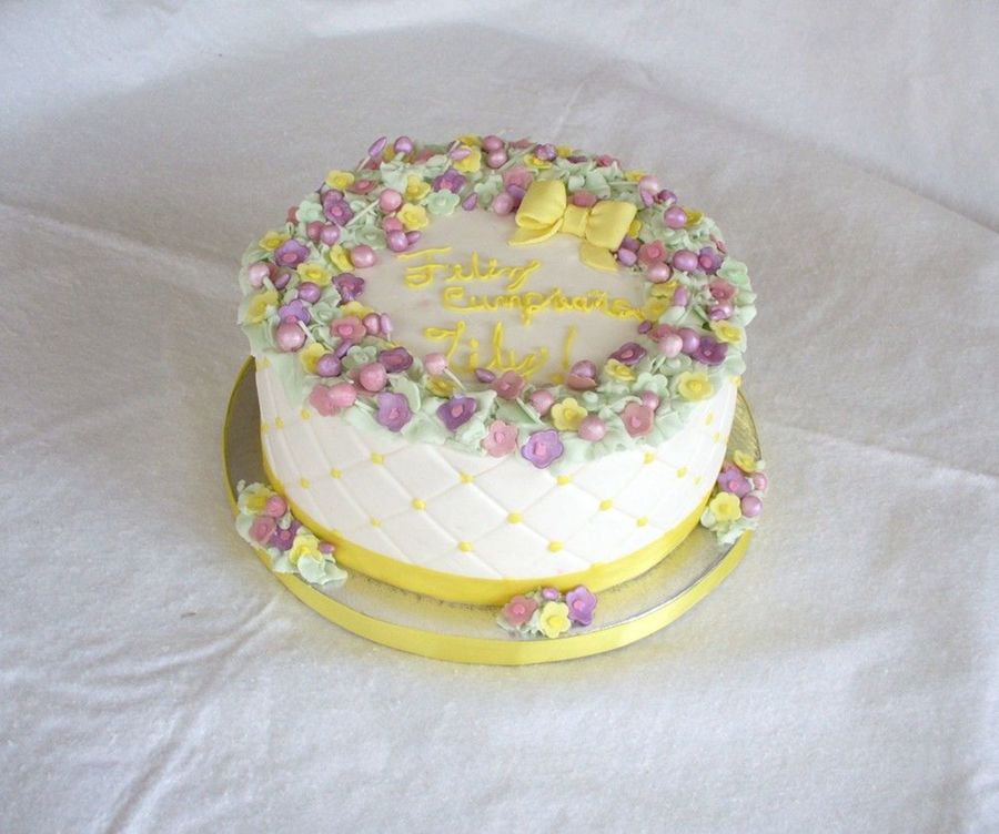 8" yellow cake with dulce de leche filling. Sugarshack bc, fondant flowers, buds, and round thingies. Sugarshack techniques and impression mat used. Need to work on my writing though! Thanks!