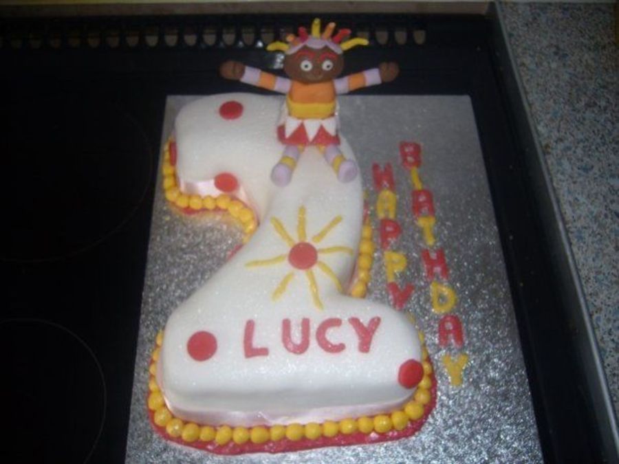 Upsy Daisy (from UK TV Show In the Night Garden) number 2 cake. Filled with Butter Cream and covered in fondant. Upsy Daisy was made 24 hours previous with Fondant with CMC powder to harden her up (it was my 2nd one as I came downstairs to realise my OH Had sat my son on the kitchen top and he had her leg in his mouth lol). This was my first cake I charged for an apparently it went down a treat