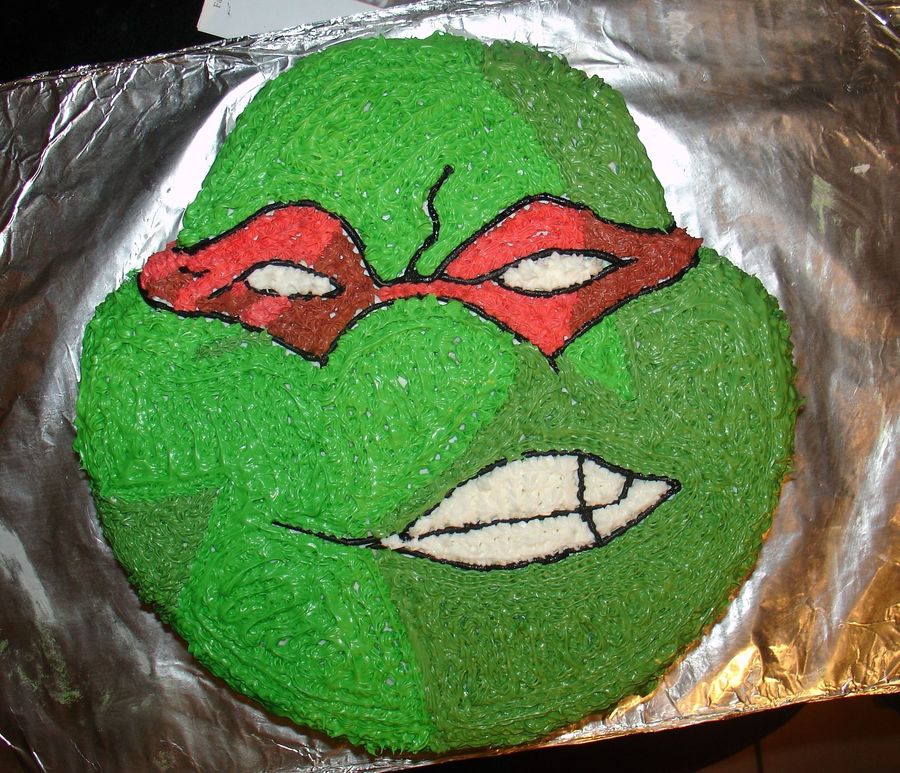 I used a 12" round cake pan and carved the face and used the party plate to decorate the turtle to match. This was before I took any classes and knew how nice the buttercream is to work with, you can tell by the stars.