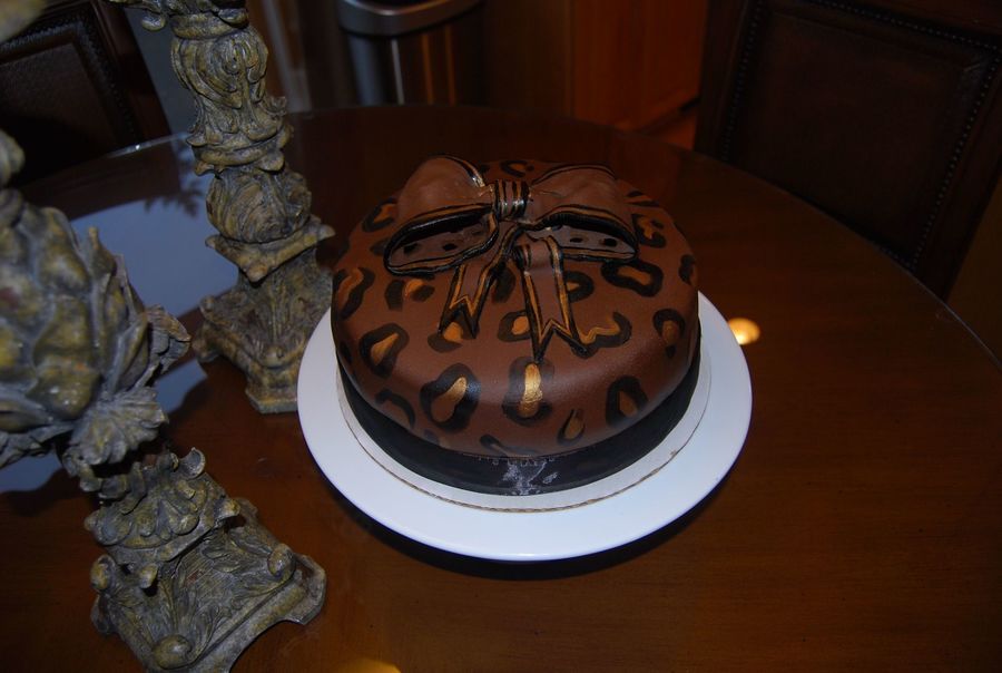 I made this cake for a girlfriend's birthday..matches her personality! Covered in chocolate fondant, fondant bow, with handpainted spots (used black paste mixed with vodka as well as aztec gold luster dust)