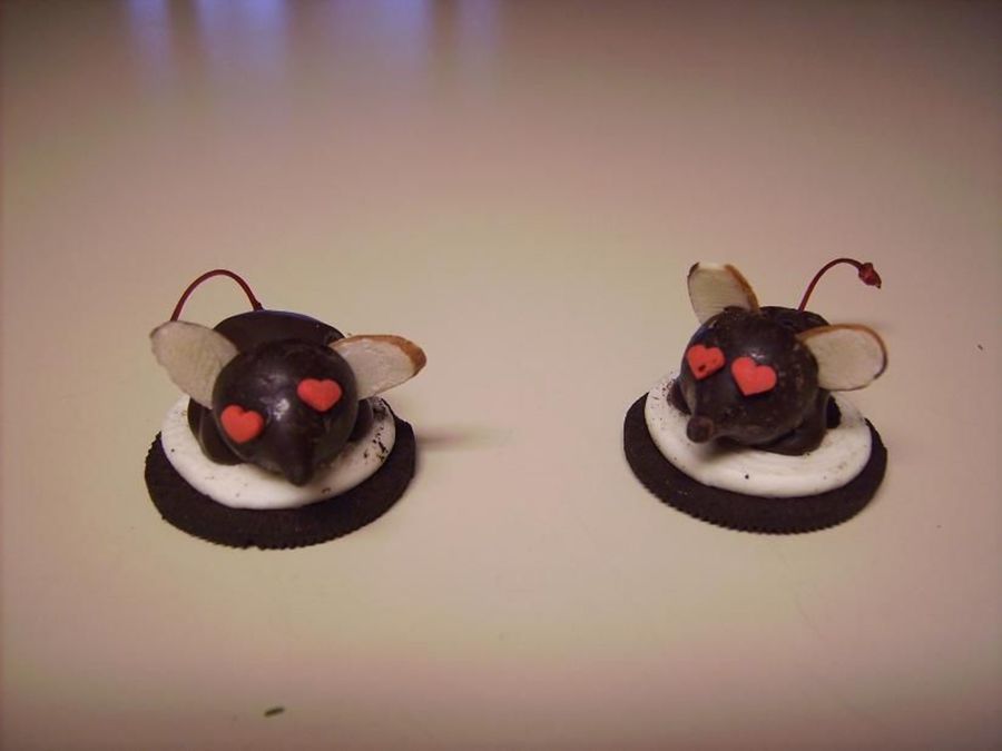 marachino cherry dipped in chocolate with almond and candy accents sitting on an Oreo cookie