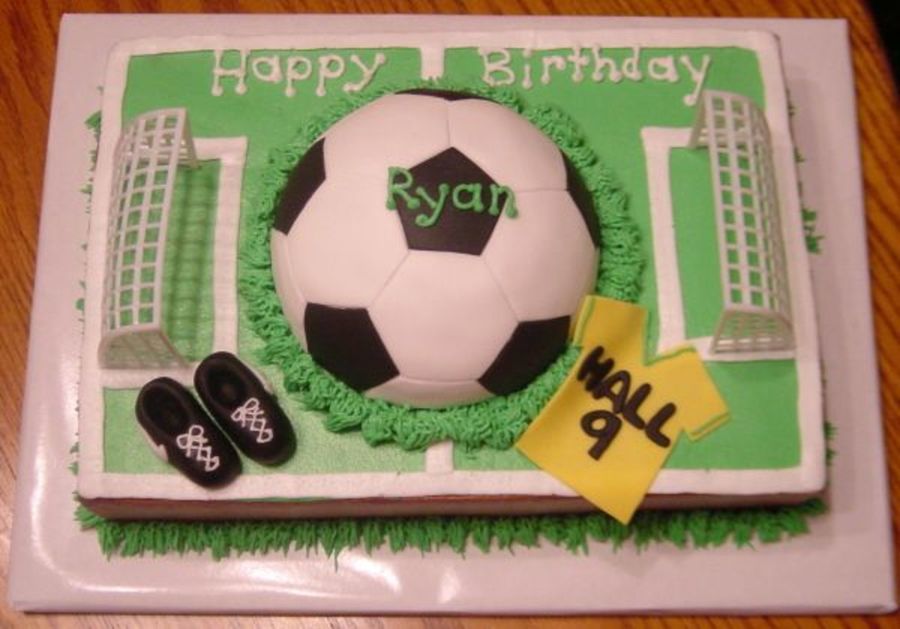 9 x 13 yellow cake with chocolate butter cream icing (under the grass which was regular butter cream). I purchased the soccer goals. The ball was made with the half ball pan covered with fondant. Shoes and jersey were also made from fondant.