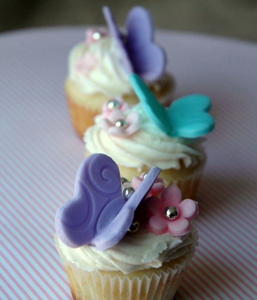 These are butterfly mini cupcakes that I made for my daughter's preschool class. They are vanilla mini cupcakes with vanilla buttercream. The butterflies and flowers are made with fondant. I used a mini cookie cutter for the butterfly shape. I am anxiously awaiting my patchwork cutters to arrive from global sugar art. TFL!