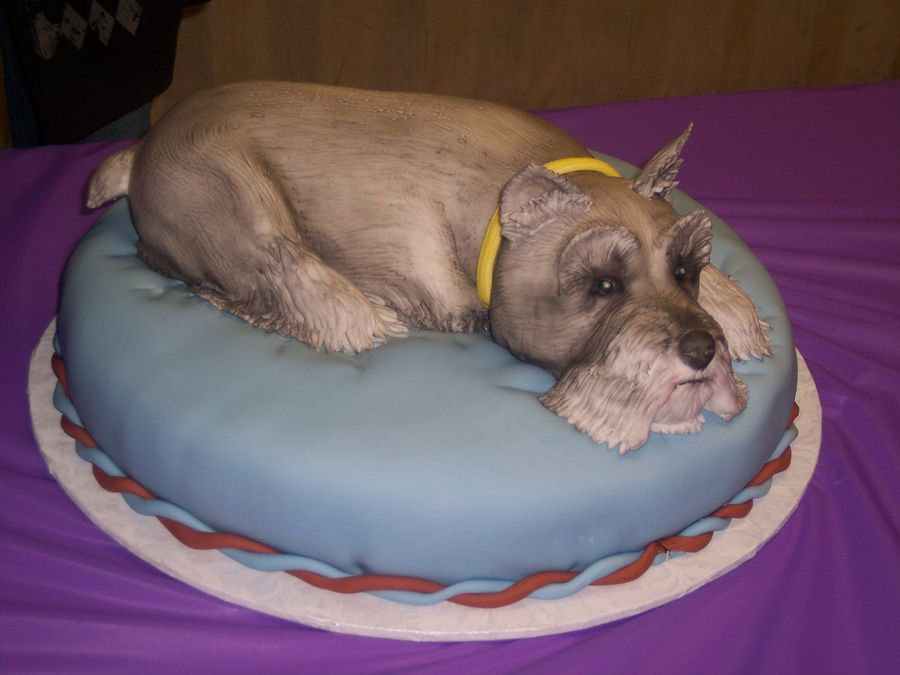 This was a cake that I did for my daughter's 10th birthday. She wanted to raise money for the Humane Society and wanted a replica of our schnauzer, Greta. We ate the pillow at her party and took the dog to school!