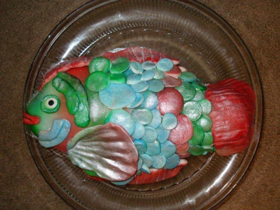 I used a fish-shaped pan to bake it in. The scales and gills are MMF. I colored it using aerosol food spray and pearl dust. The eye is a candy available at specialty baking stores.