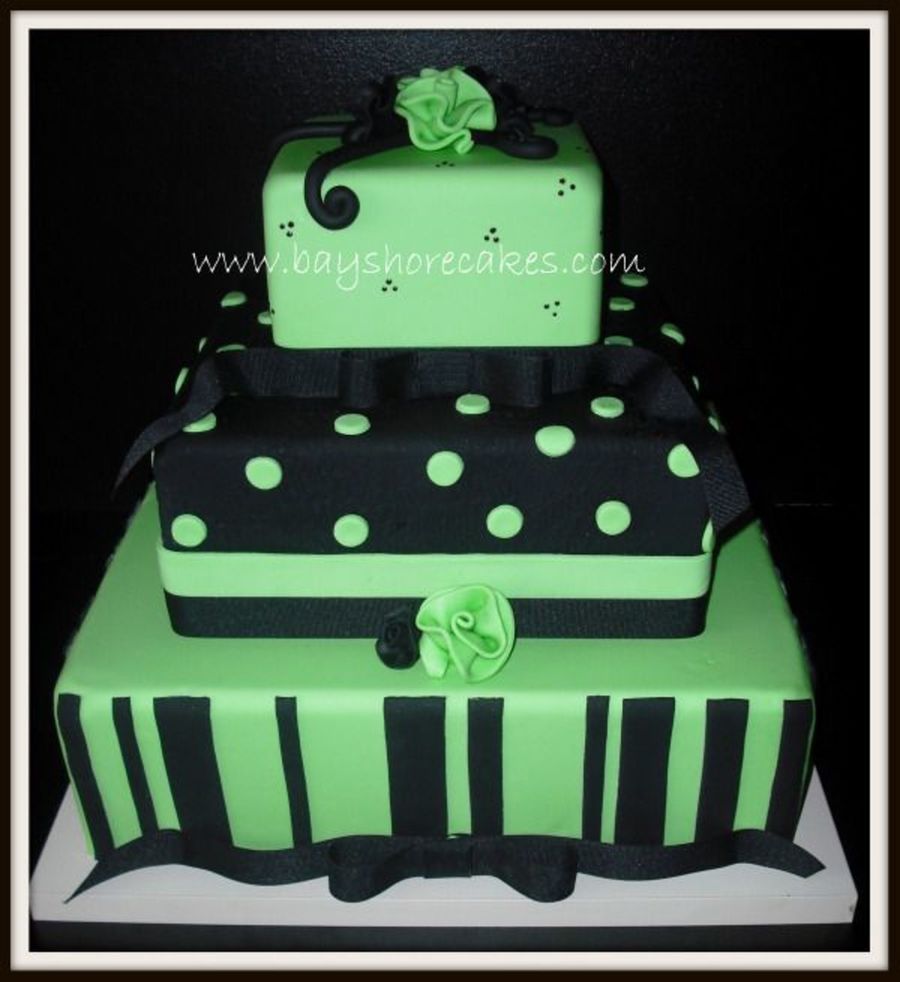 All covered in MM fondant, black ribbon around the base of 2 of the tiers. MM fondant ribbon roses. On the black tier I used an impression rolling pin, but the photo doesn't show it very well. Thank you for looking!