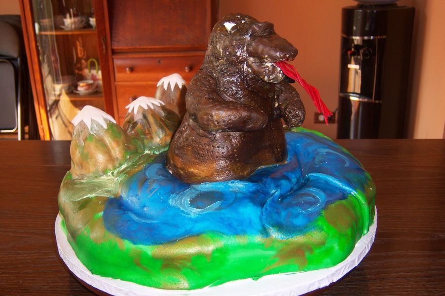 This is a photo of a Godzilla cake for a 50th birthday. The cake was sculpted out of chocolate cake, frosted and covered with fondant. The mountains and base are also made of cake and fondant. The only part that is facade are the tips of Godzilla's hands, which were made with risce krispie treats.
