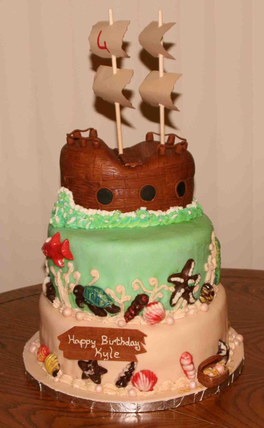 Made for a friend's coworker who ordered it for her son's 4th birthday. She will add Peter Pan figurines to it for his "Hook" party. Thank you to bjfranco, ticelebrations, and shantel575 for posting the pictures of pirate ships that I was able to use as inspiration. Bottom tier: 12" round WASC with Lemon Buttercream Middle tier and Pirate ship: Chocolate Almond SC with Chocolate BC. Everything covered in Michele Foster's fondant. Sea creatures and shells are candy melts. I opted to make the sails paper instead of gum paste because the cake has to travel an hour and a half and I was afraid that they might break. TFL!