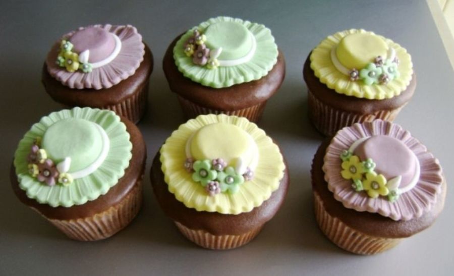 Cupcakes covered with chocolate poured fondant and rolled fondant hats.