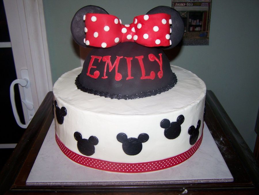 This was a different take on the Minnie Mouse cake I had already done. I like this one better. The hat was covered in Satin ice fondant and the ears were fondant as well. The bottom cake was iced in BC with BC Mickeys. The birthday girl was thrilled with it!