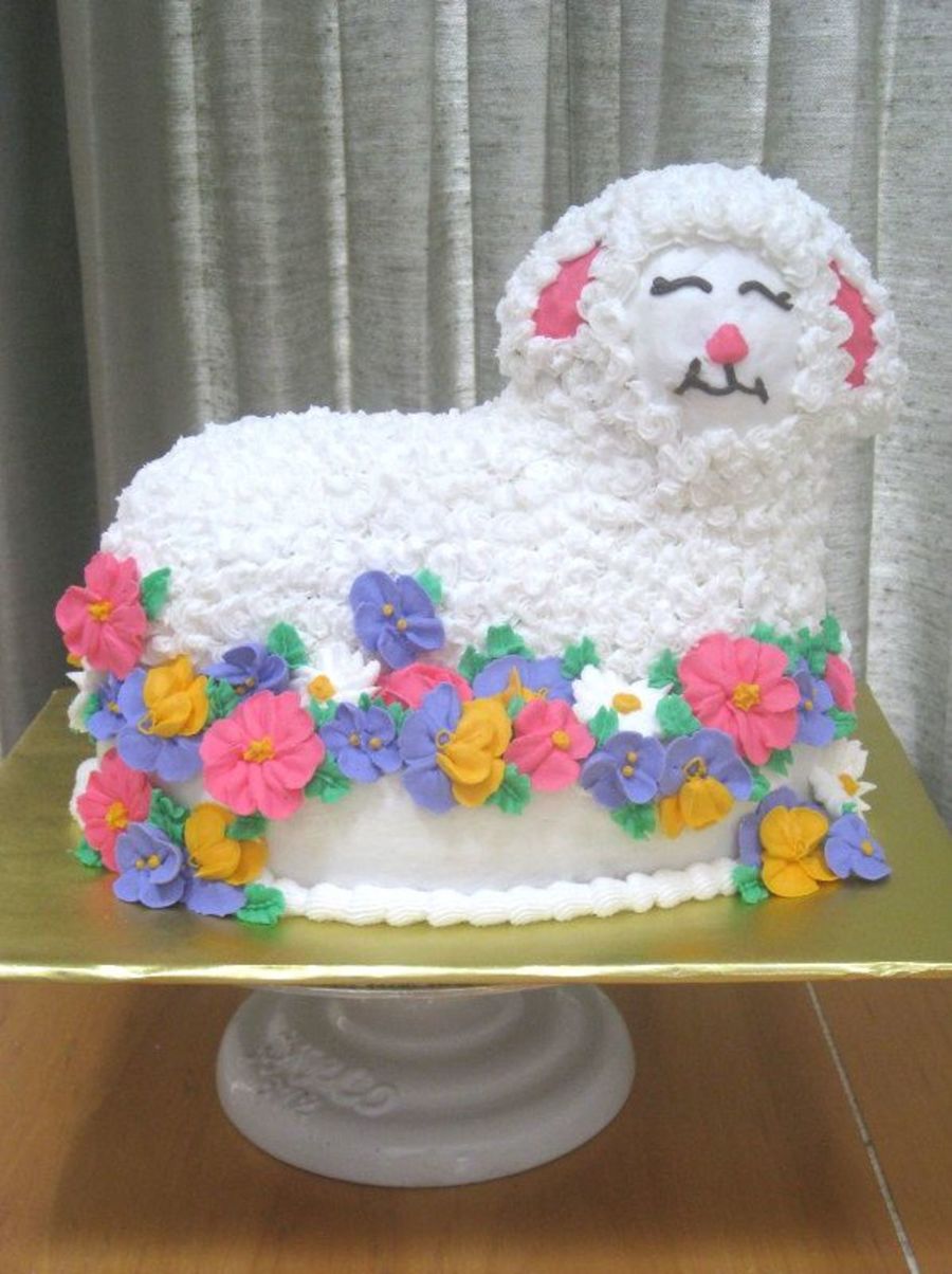 This is the stand-up lamb pan cake on top of an oval cake. The flowers are royal icing.