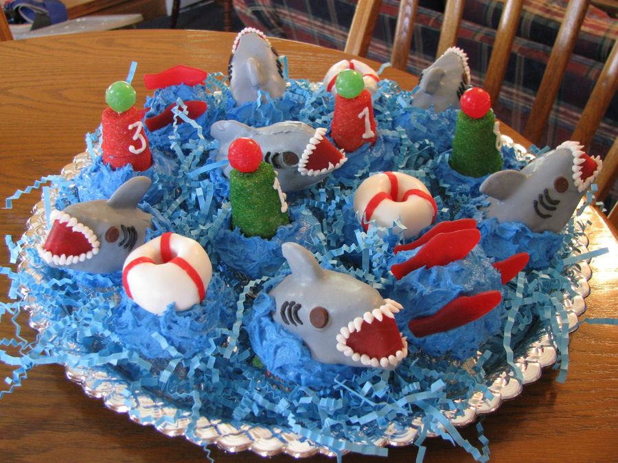 Cupcakes decorated like sharks coming out of the water. Idea from the book "Hello Cupcake!" by Karen Tack and Alan Richardson