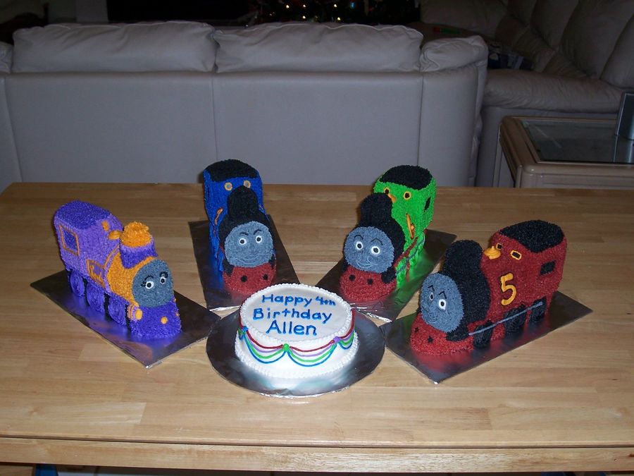 For my son's 3rd birthday, I made Thomas with Annie and Clarabell and another freight car with a caboose with a "3" candle...ALL the kids wanted a piece of Thomas so I had tons of cake left! For this one, I got smart and did four engines!