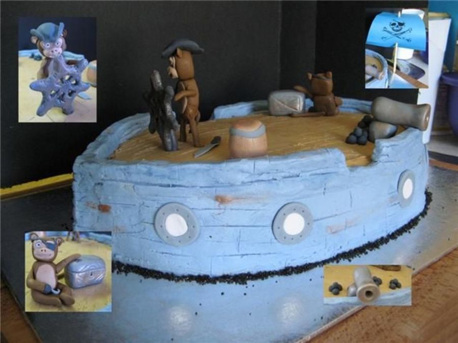 Composite photo of pirate monkey cake. chocolate cake buttercream icing fondant monkeys and accessories. Mast made of breadstick inserted at the party.