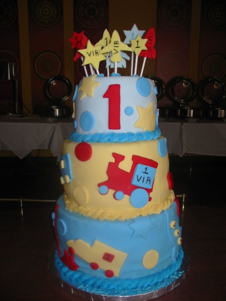 This tiered cake is covered in fondant with fondant cutouts of planes, trains, rockets etc