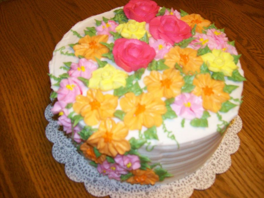 This cake was made for a lady who said she just wanted lots of flowers in pink, yellow and orange (mostly orange) and buttercream. I think I really need to practice making flowers!