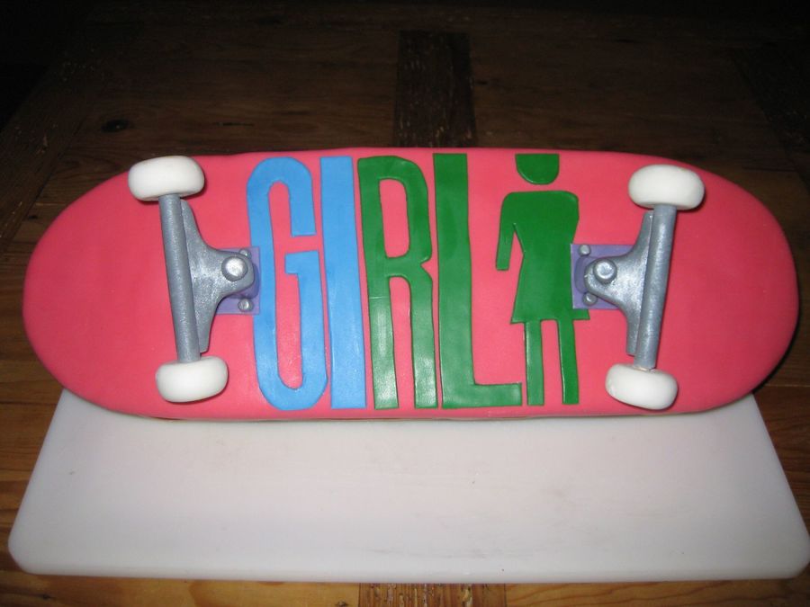 This was my first attempt at a skateboard cake. The design was copied from an actual skateboard. Covered in fondant. Everything is edible (except the wooden dowels in the "chrome" part of the wheels).
