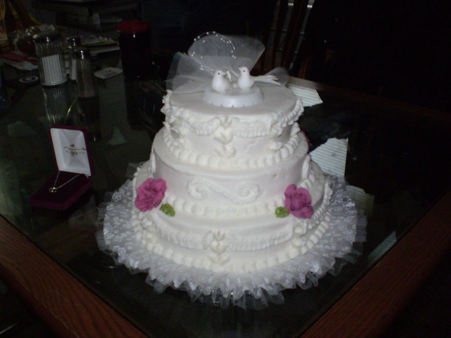 Sorry this is so dark. I make a replia of my parents wedding cake. All buttercream with gumpaste roses. My mom was very teary eyed!