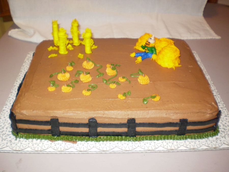 My birthday is in Oct and my favorite pro football quarterback's b-day is the same as mine. So I made the scarecrow in his honor with his #4. All buttercream. Big blobs of buttercream to shape the haystacks. I used the grass tip to cover the haystacks. And pretzle rods for the corn stalks.