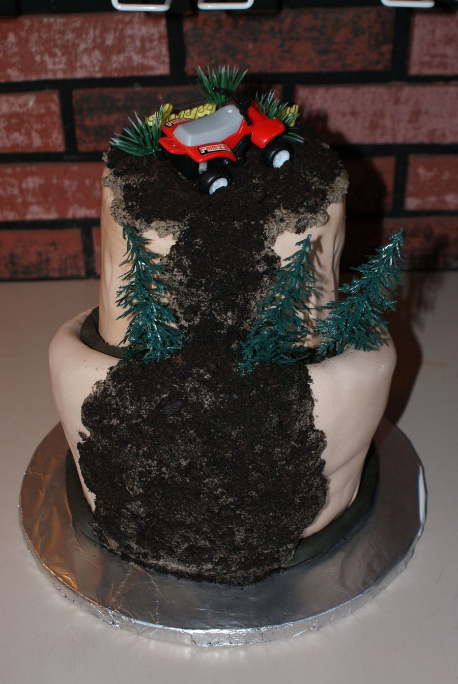 This was my very first attempt at a "creative" cake. It was for a friend's birthday. He loved his 4 wheelin'. The 4 wheeler sits atop the Mtn. Notice the dirt slide down the side. It took some work, but he made it to the top!