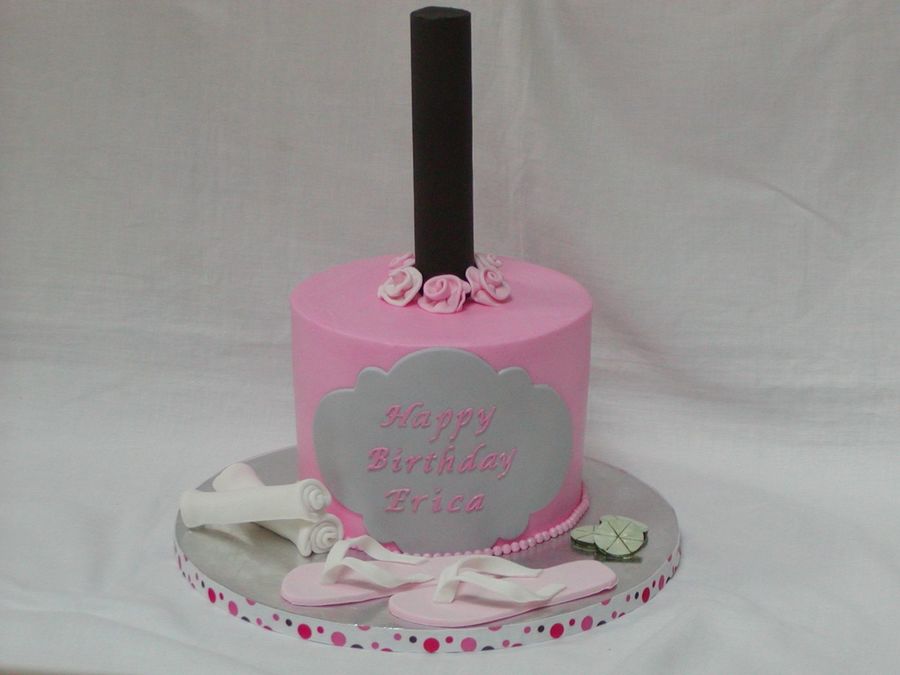 This was made for a little girl's 6th birthday. Party was at a nail salon where the girls where pampered - nails, hair, cucumbers on the eyes etc. 2 8" stacked and iced in bc. fondant flip-flops, spa towels and cucumbers.