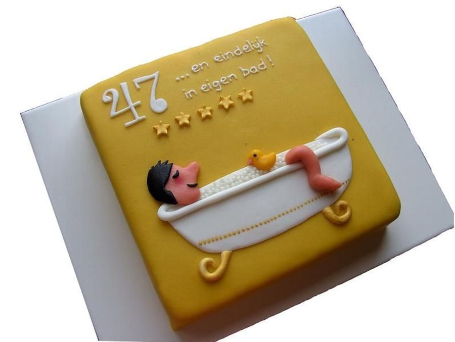 ...it sais: 47 and finally in own bath. Made for a friend of my parents who's working at his bathroom. Nice detail: cake's standing on a tile... ;)