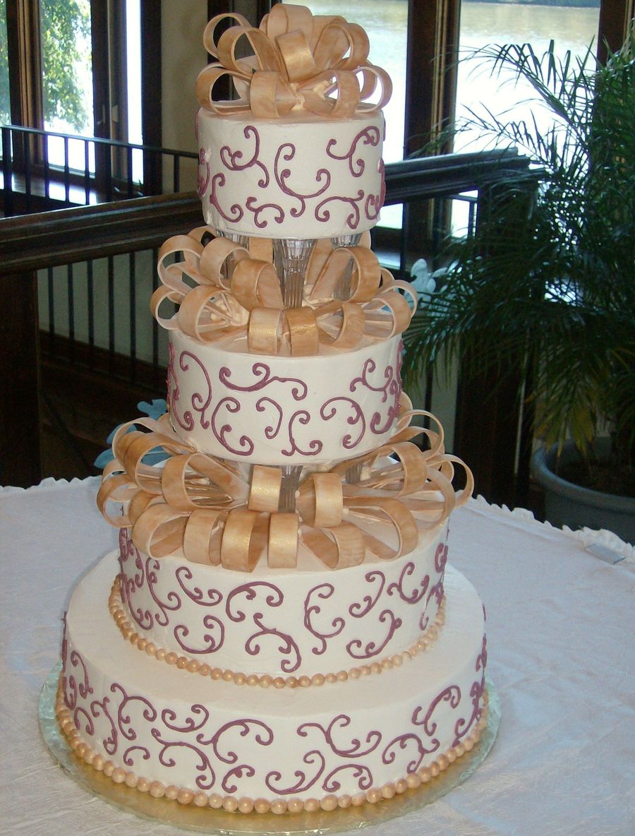 Wedding cake for my cousin.....the bow loops are made wiith gumpaste. I rolled them out with my pasta machine and then cut them to size.....shaped and dried. Painted with gold luster dust. the rest of the cake is all buttercream.