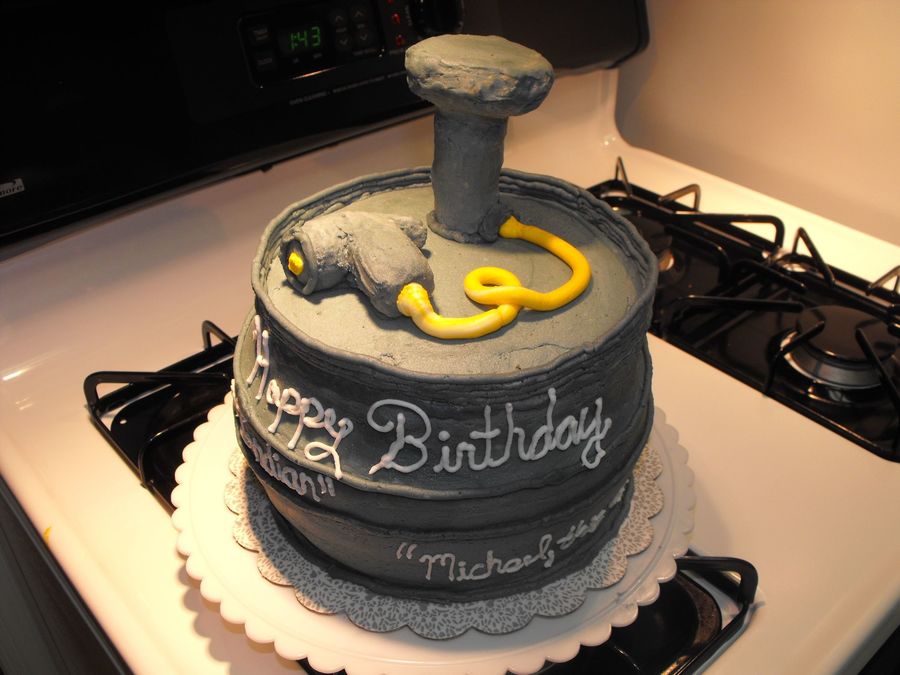 This was 4 cakes stacked up and iced with grey coloring. The pump and the spout was made out of Rice Kripies. Everything else was made of icing; including the rim which I took a small tip and went over the edge again and again. Then they wanted certain quotes from movies all over the cake