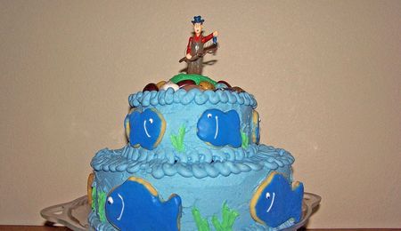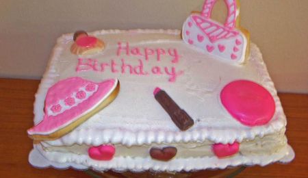 14 inch square, 3 layers for a work pot luck. (a large cake!) A butter cake with bavarian creme and strawberry filling covered in fondant, with fondant accents.