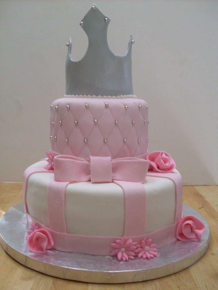 I've done this cake twice now. It is all made from MMF, including the crown, which was colored a light gray, and then I used pearl luster dust to make it shiny. It's such a girly cake...